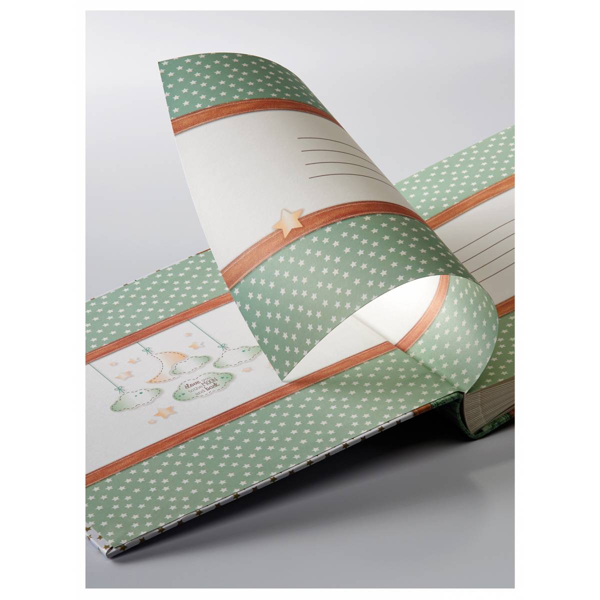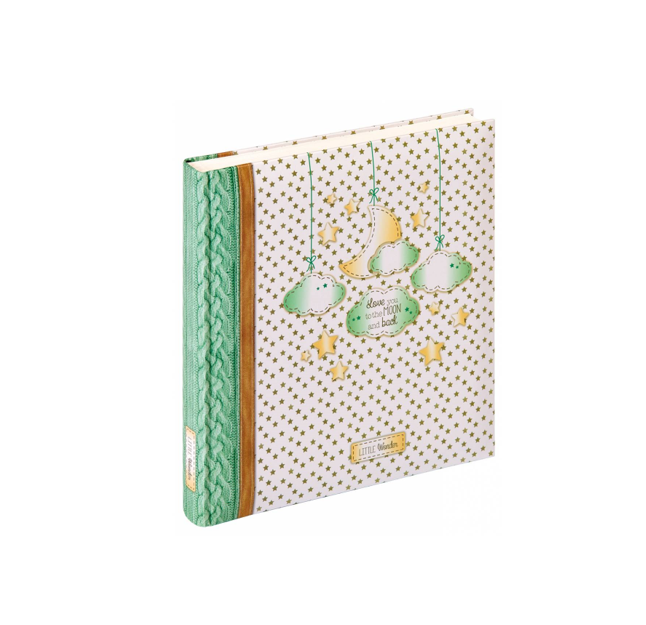 Álbum para bebés encuadernado en libro con diseño de estrella y cubierta con impresión artística laminada de alta calidad. El álbum en formato 28×30,5 cm tiene 50 páginas blancas de cartulina fotográfica libre de ácido con hojas protectoras de glassine blanco, un líder ilustrado de 4 páginas y está equipado con un CD y archivo de negativos. Color: 1 diseño