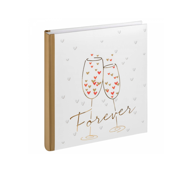 - Álbum de boda encuadernado en un libro con la inscripción “Forever” en lámina de oro en relieve y una cubierta de impresión artística laminada de alta calidad.