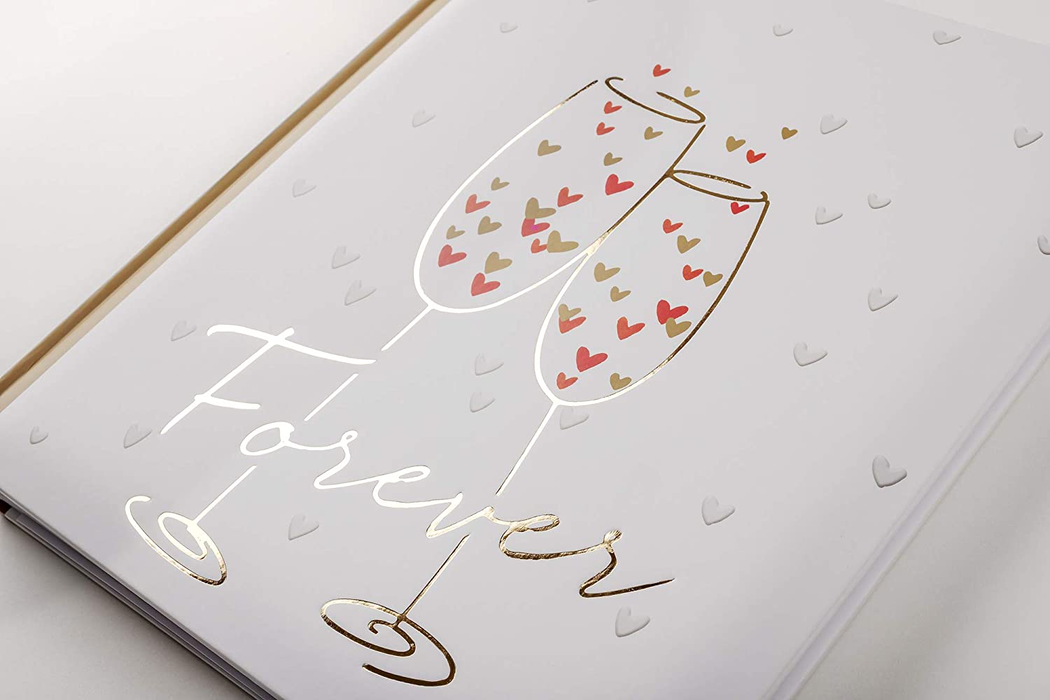 - El álbum está decorado con pequeños corazones y las dos copas de champán están grabadas con papel dorado.