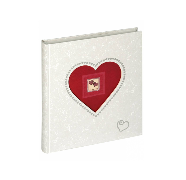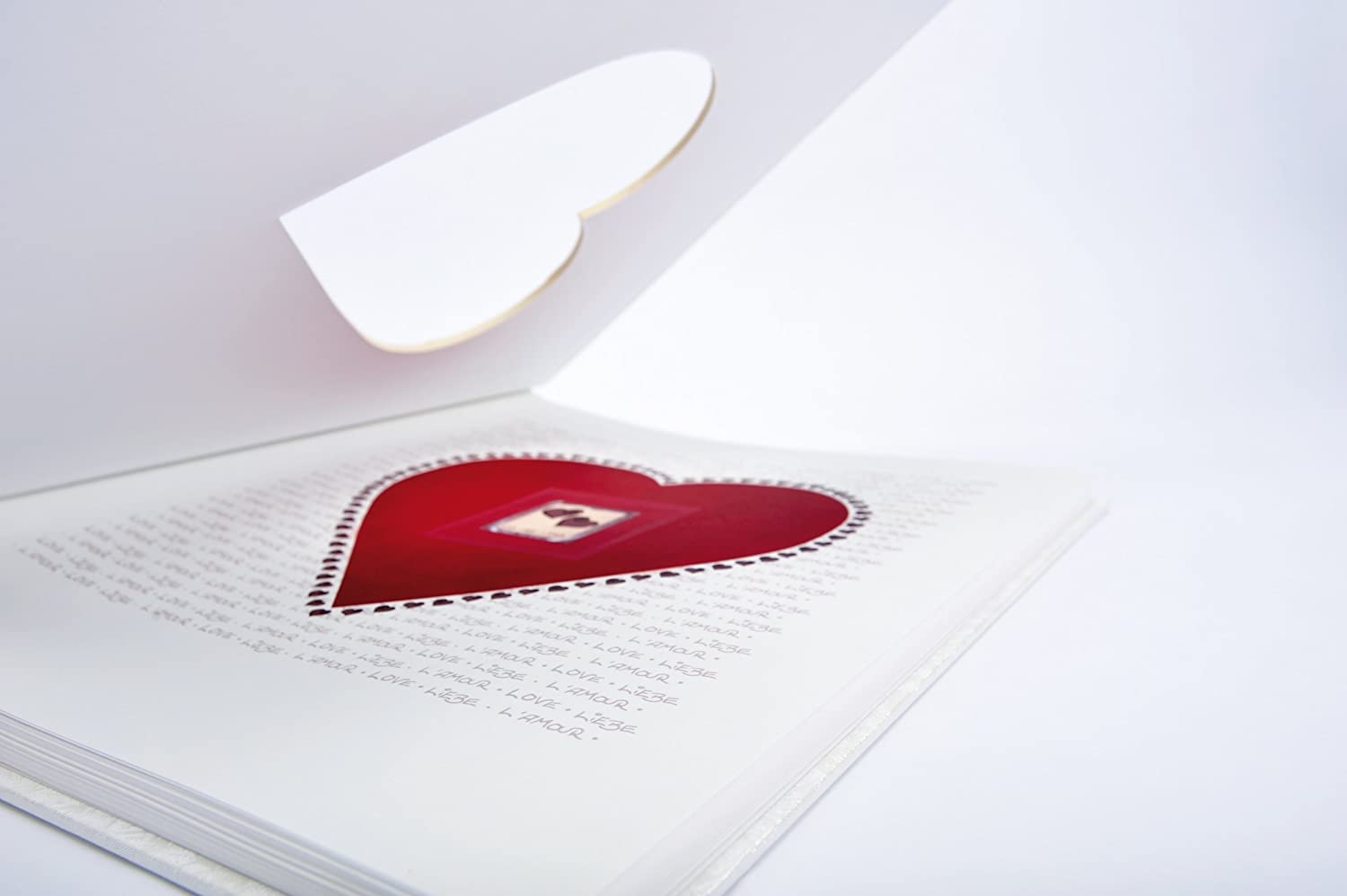 El álbum está refinado por un gran corte de corazón en el frente, que está rodeado de pequeños corazones con un relieve plateado. El álbum en formato 29×32 cm tiene 60 páginas en blanco de cartulina fotográfica sin ácido con hojas protectoras de glassine blanco, una página de apertura ilustrada a 2 caras y está equipado con un CD y archivo de negativos.
