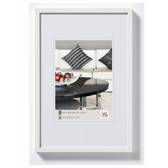 Vidrio: vidrio transparente lavado Inserción: perforado, blanco - Panel trasero: MDF, arriba hasta 21 x 29,7 cm con suspensión de pantalla: ojales de suspensión para formato horizontal y vertical, desde 40×50 cm con suspensión de galería