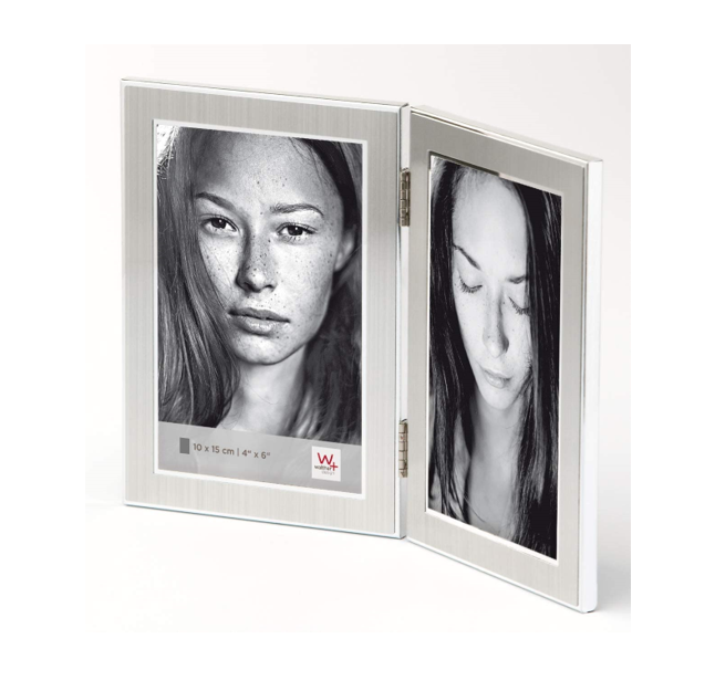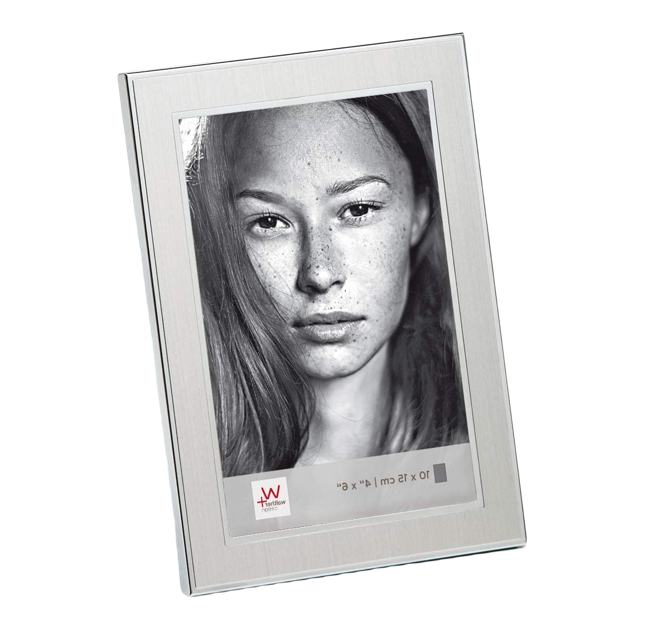 - Marco de metal con perfil plano en plata mate y borde interior y exterior brillante.